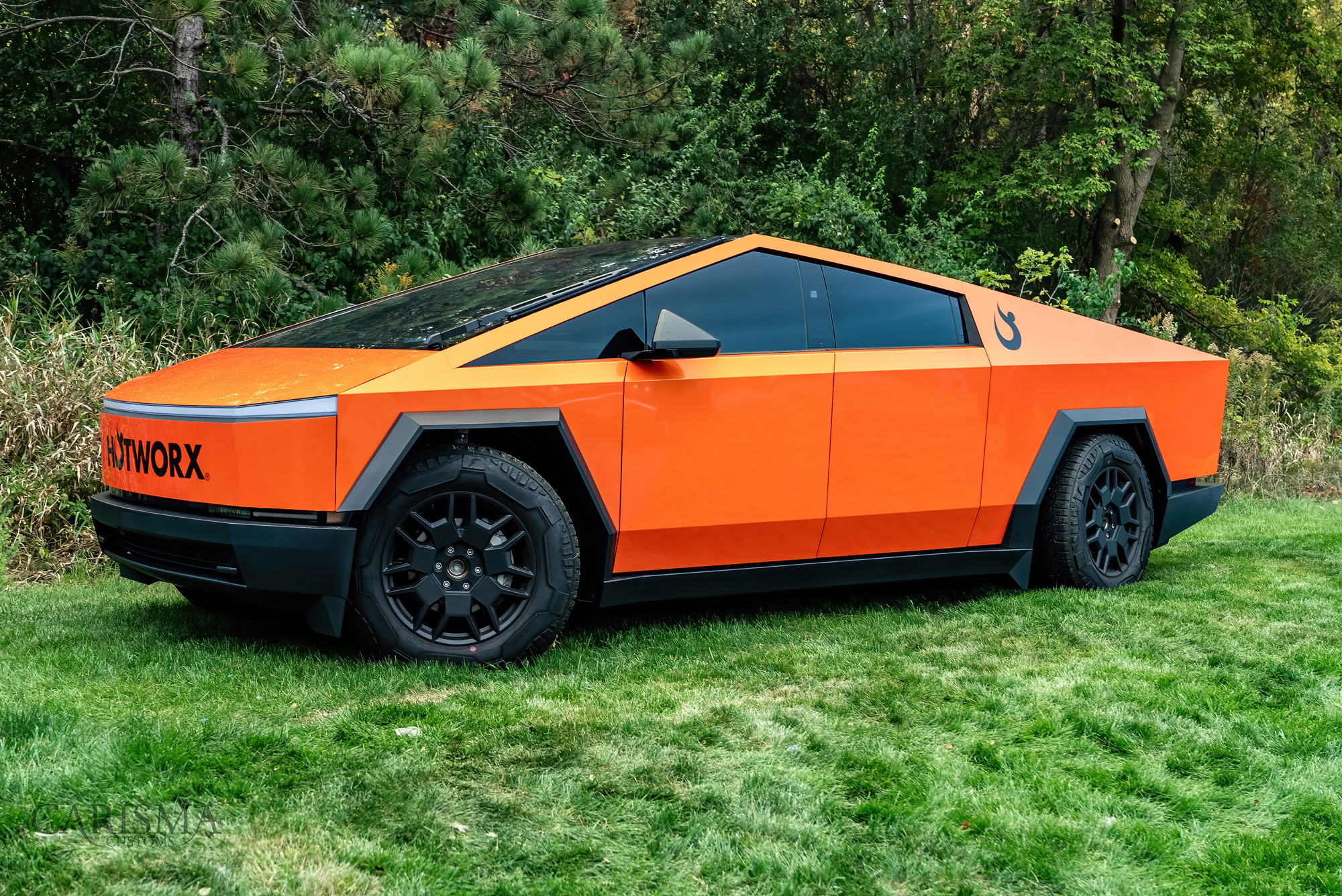 Readable fleet graphics scale cleanly to the Cybertruck’s large panels.